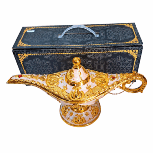 Agrega un toque de misterio, elegancia y cultura oriental a tu espacio con esta exquisita lámpara de Aladino blanca con detalles dorados, elaborada con delicadeza y un acabado brillante que evoca el encanto de los cuentos árabes. Con unas dimensiones de 35 cm de largo, 20 cm de altura y una base de 11 cm, esta pieza es perfecta como centro de mesa, decoración temática, ambientación mística o accesorio para eventos especiales.